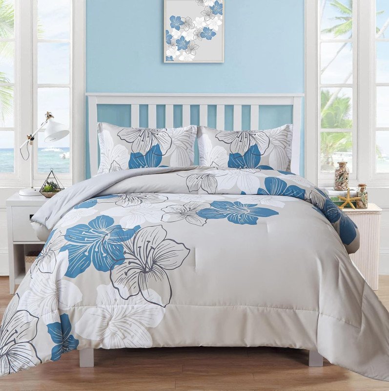Most of us don’t have the money to swap our bedding out with the seasons, but when the right deals come along, you get to experiment with more than just one option all year long. This floral three-piece set, which includes two pillowcases and a comforter, features beautiful floral designs with overlapping hibiscus flowers printed in three colors.Â