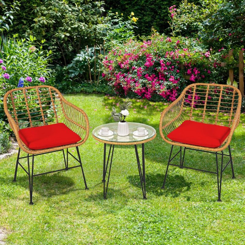 This set is the pint-sized perfection, and we can’t get enough of it. With a powder-coated stainless steel frame, the base of this set is rustproof and corrosion-resistant. Each piece is then wrapped in lovely rattan wicker, adding a gorgeous rustic touch to an otherwise-industrial design. Included with the set are two ergonomic armchairs and a small bistro table. Each chair has a fun, bright red seat cushion that makes for an incredibly comfortable feel.Â