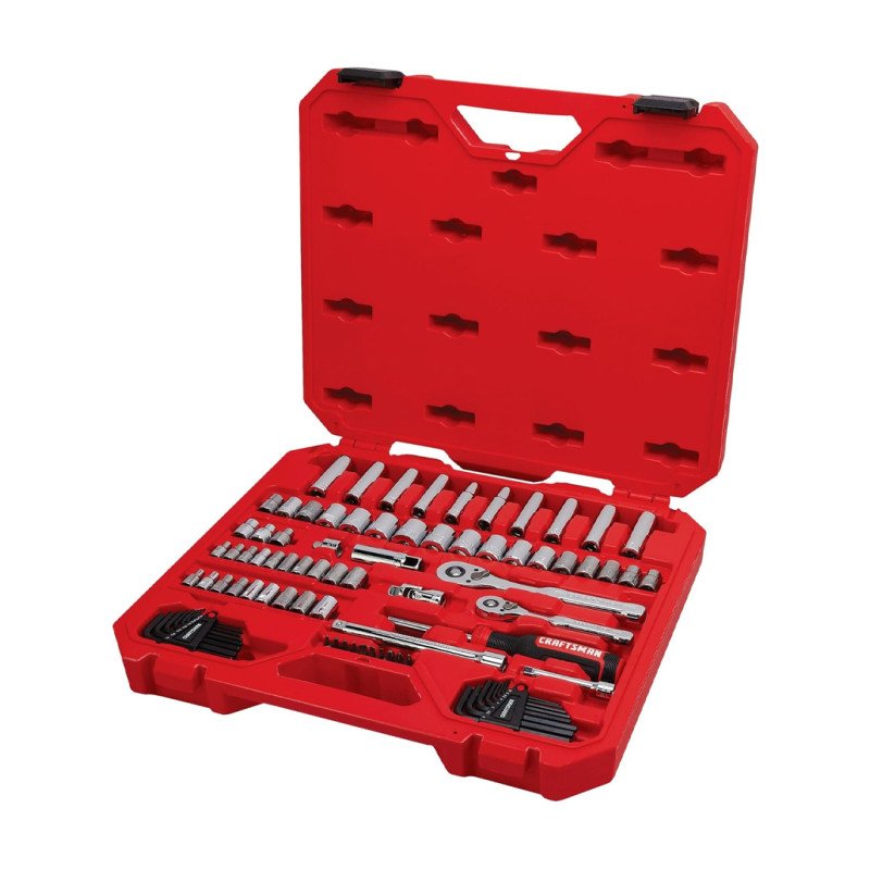 This tool set has just about everything you need to do repairs to your vehicle, or even around the house. The SAE/metric kit includes 2 ratchets, 39 standard sockets, 10 deep sockets, 16 short arm hex keys, 2 extension bars, 10 specialty bits, a spark plug socket, a universal joint, an adapter, and a bit driver. Additionally, you get a large plastic case that holds everything in place. The case is even designed to fit comfortably inside a Craftsman metal storage box. While the set doesn’t include extra deep well sockets for deep engine work, that’s likely not something you would undertake on your own. Nevertheless, the tools that come with this set are built to last. You can be sure that when you buy Craftsman tools, you’re getting a product that was designed and tested for longevity and convenience.