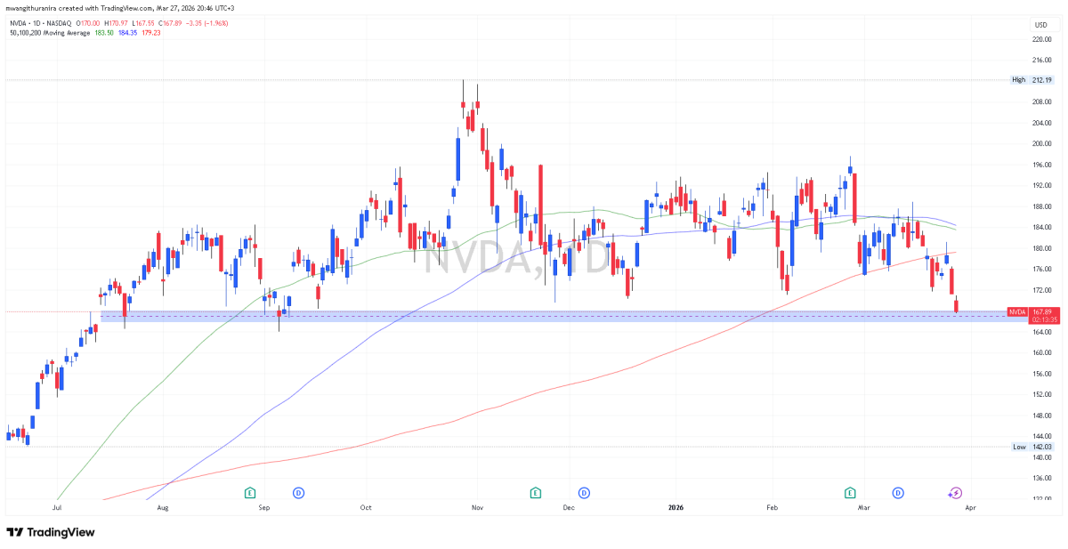 Shares of NVDA dropped more than 4% on March 26, 2026, pushing the stock deeper into a short-term downtrend. The pullback now leaves Nvidia trading roughly 20% below its all-time high of $212, set in late October 2025.
