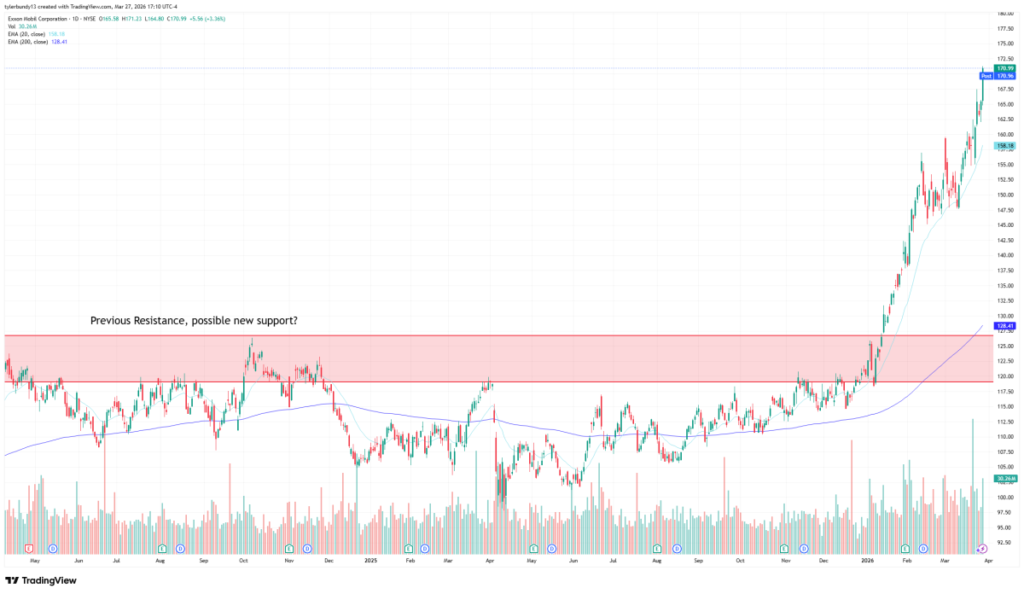 There’s a strong level underneath the stock. A former resistance zone between roughly $120 and $127 now looks like a possible support band if oil starts to cool off.