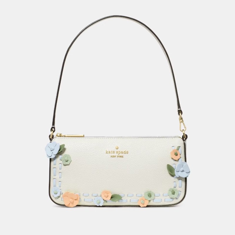 This floral mini bag is adorned with pastel pink, green, and blue accents that catch the eye and add some fun to any outfit. It looks sophisticated against the cream-colored pebbled leather bag and gold hardware. The convertible shoulder strap has a 7.5-inch drop that sits perfectly on your shoulder, offers an easy way to carry it by hand, or can be clipped into a wristlet loop to dangle around your arm.Â