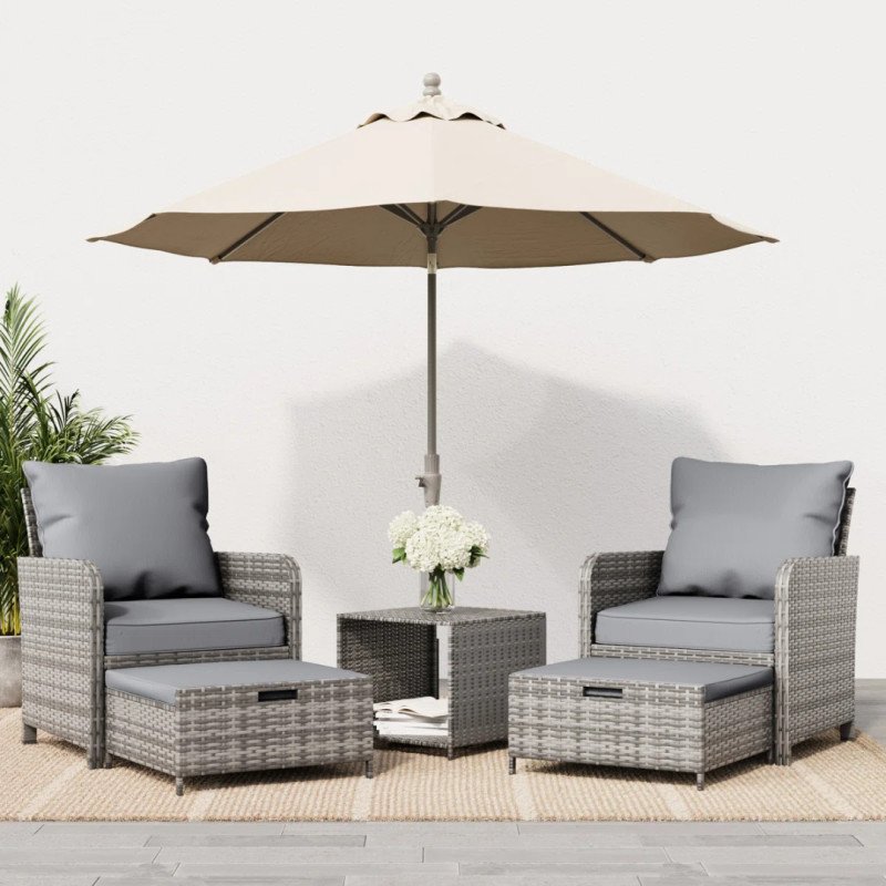 The entire set compliments each other well, especially since all five pieces are made from the same polyethylene (PE) wicker rattan material. The woven synthetic material is perfect for outdoor furniture because it’s super durable under constant exposure to the elements. It’s specifically made with UV-resistant wicker, so it won’t bend, break, crack, or wilt under sun exposure, and it’s wrapped around a rust-resistant steel frame for extra sturdiness and stability. The chairs and ottoman have 3-inch foam cushions with zippered covers that are easy to throw into the machine for cleaning.Â